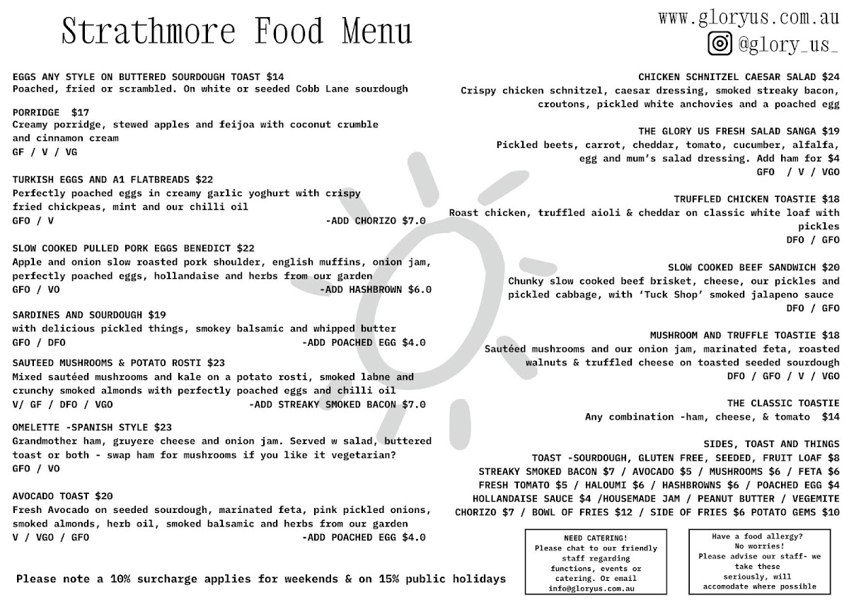 Complement your meal with selections like streaky smoked bacon and haloumi, crafted from seasonal ingredients ensuring freshness. With friendly service and an inviting atmosphere, every visit to Glory Us promises to leave you smiling and satisfied.