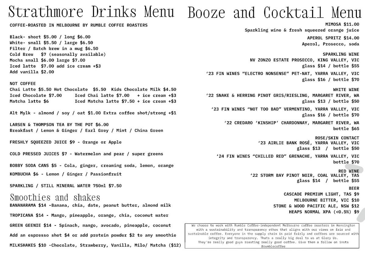 Welcome to Glory Us, a charming café nestled in Strathmore, VIC, where culinary creativity meets warm hospitality. The menu showcases a delightful array of offerings, ensuring both comfort and innovation in every bite. Begin with their smooth banana and Tropicana smoothies, each priced at A$14.00—perfect for a refreshing start.